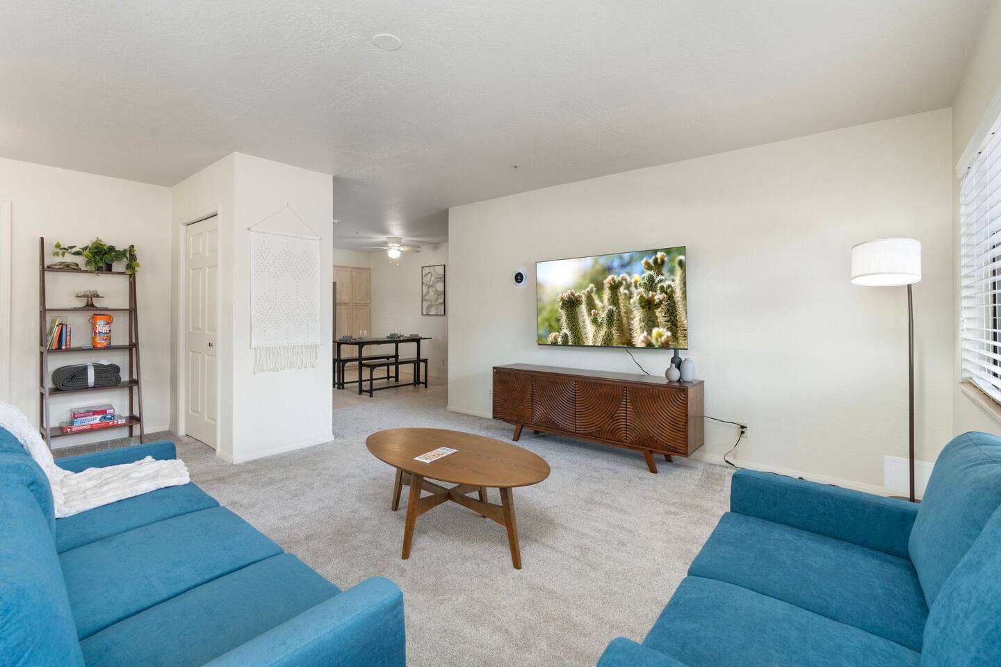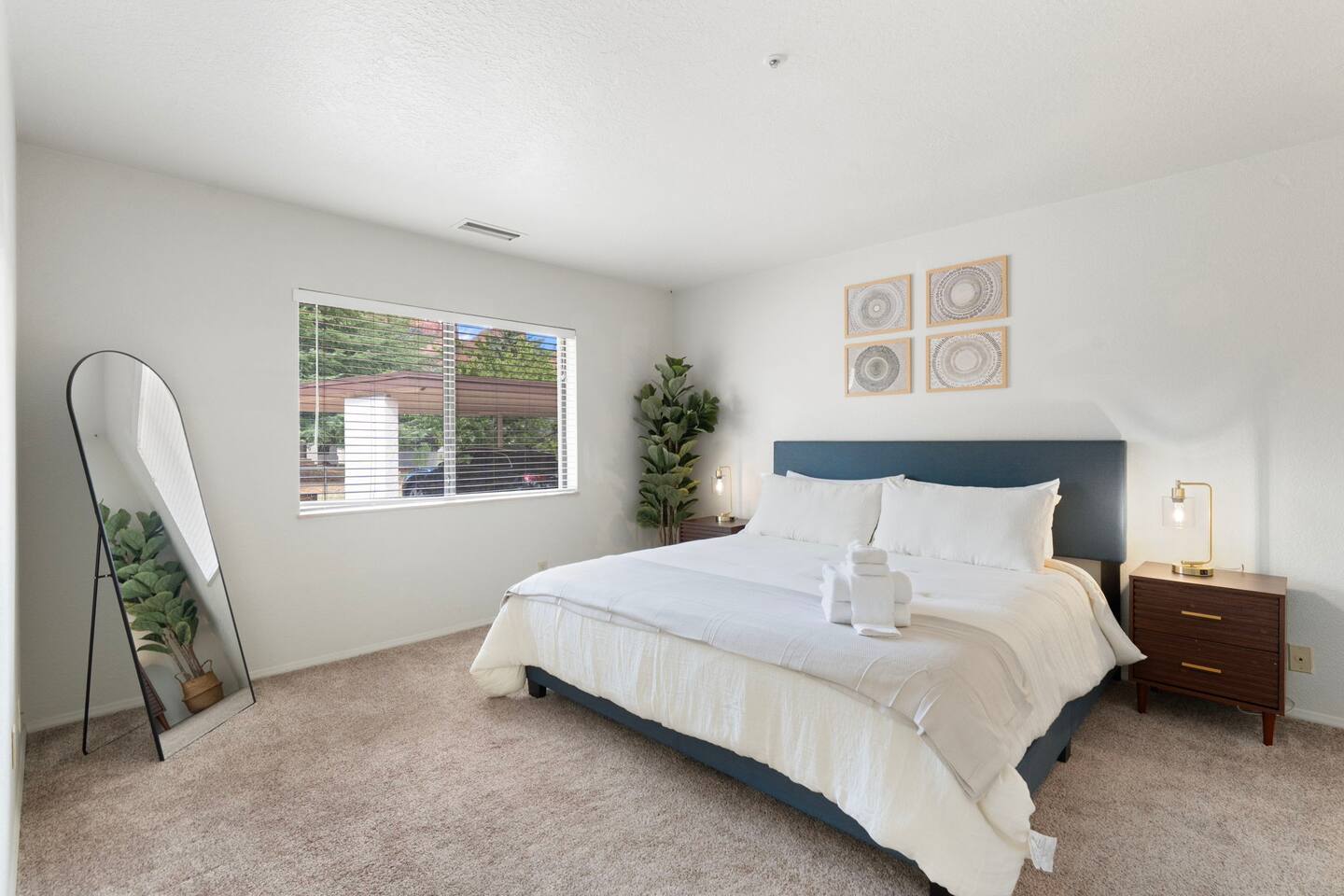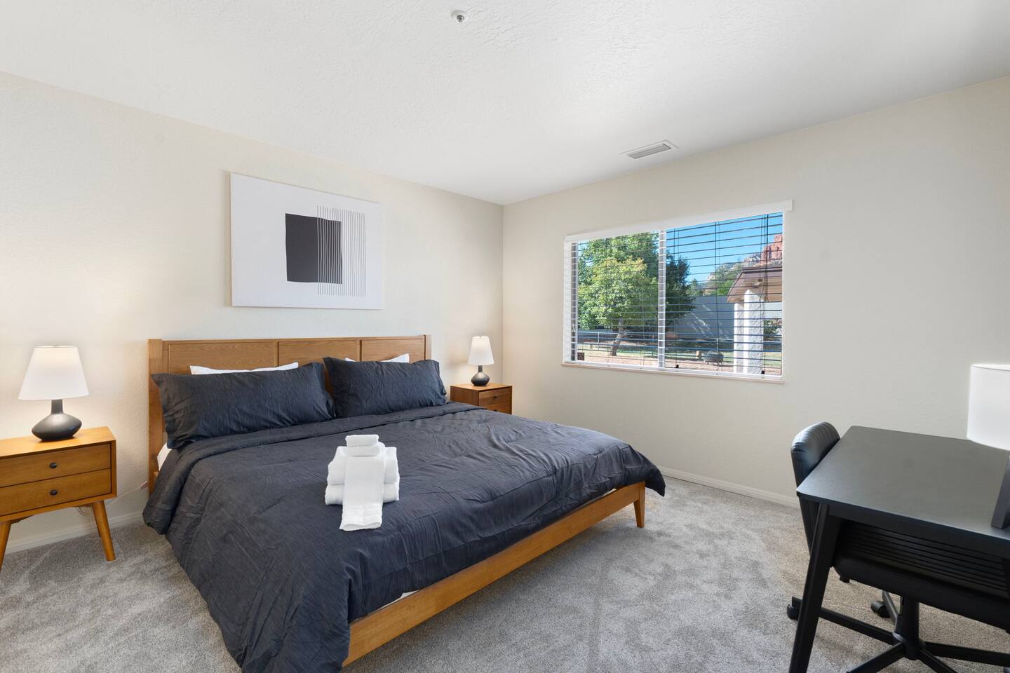 Offering 4,373 SF of living space across 4 units, this rental is the perfect blend of personal space and shared experiences. Featuring 7 bedrooms and 4 bathrooms, plus 4 sleeper couches, this property comfortably sleeps up 18 adults. With onsite laundry and 8 covered parking spaces, you may not need to drive after arrival. Situated on over 1/2 an acre, enjoy seeing deer, rabbits, and other wildlife in the yard with panoramic red rock views in the background. 1 minute drive (.5 mile) to Uptown, everything you need for a spectacular vacation is within reach. Unit A: King Bedroom with Dedicated Workspace Queen Bedroom with Walk-In Closet Double-Vanity Full Bathroom Full Kitchen with Dining Table and Living Room Private Covered Patio Unit B: King Bedroom Full Bathroom Full Kitchen with Dining Table Living Room with Fireplace Shared Covered Patio with Porch Swing Unit C: King Bedroom with Dedicated Workspace Twin Bedroom with 2 Twin Beds Full Bathroom Full Kitchen with Dining Table and Living Room Shared Covered Patio with Group Dining Table Unit D: King Bedroom Queen Bedroom Full Bathroom Full Kitchen with Dining Table Living Room with Dedicated Workspace Laundry: Washer and Dryer with Additional Supplies Private Storage Units for Luggage Drop-Off Curated for traveling groups, the property is perfect for getting together while also offering personal space for quiet mornings and comfortable nights. Each kitchen is fully stocked and equipped for cooking and each living room includes board games and activities.