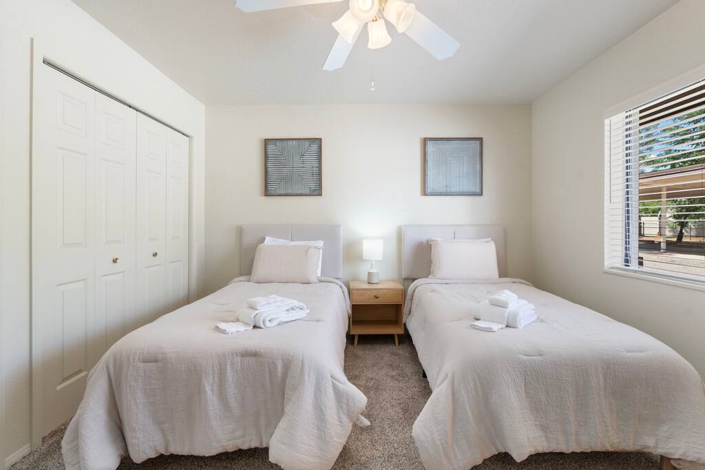 Unit C offers a welcoming 2-bedroom, 1-bath retreat designed for comfort and connection. The open living room is perfect for gathering, while a fully equipped kitchen and dining area make meals at home easy. Plush bedrooms and quality linens ensure restful nights after a day of red rock adventures. LIVING ROOM ✔ Sofa and seating area for relaxing ✔Pull out couch for extra sleep space ✔ Smart TV for streaming your favorites ✔ Board games and books for downtime KITCHEN & DINING ✔ Fully stocked kitchen with modern appliances ✔ Coffee maker, tea, and basic staples provided ✔ Dining table for four BEDROOM 1 ✔ King bed with plush mattress and linens ✔ Closet and storage space BEDROOM 2 ✔ Two twin beds with plush mattress and linens ✔ Closet and storage space BATHROOM ✔ Full bath with shower/tub combo ✔ Towels, shampoo, conditioner, and body wash provided HIGHLIGHTS ✔ Ideal for families or small groups ✔ Centrally located near Uptown Sedona ✔ Easy access to hiking, dining, and shopping